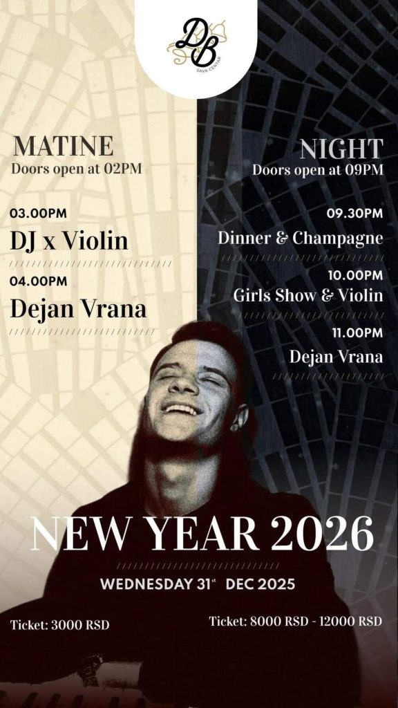 Naša svečana novogodišnja večera nudi raznovrsne specijalitete koji će zadovoljiti svačiji ukus. Uz večeru, piće će biti dostupno po utrošku, a svi gosti će dobiti piće dobrodošlice. Uživajte u muzici koju će izvoditi Dejan Vrana, uz pratnju talentovanih izvođača Girls Show & Violin, koji će dodatno obogatiti vašu novogodišnju noć.